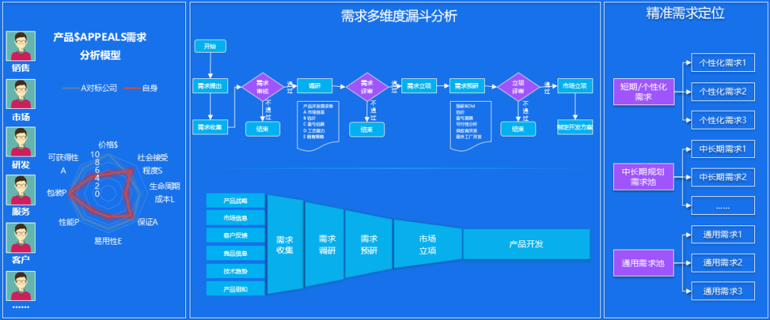 需求管理的目標(biāo)是精準(zhǔn)把握市場需求,通過對收集的需求進(jìn)行分析,進(jìn)行結(jié)構(gòu)化、標(biāo)準(zhǔn)化、量化的定義,一方面可以更透徹、更全面地理解市場需求,另一方面使需求在企業(yè)所有與產(chǎn)品相關(guān)的人員中得到準(zhǔn)確一致的理解。通過把控立項流程,篩選出符合企業(yè)戰(zhàn)略目標(biāo)的產(chǎn)品,削減沒有市場機會的產(chǎn)品,精準(zhǔn)產(chǎn)品定位,集中資源投入到優(yōu)質(zhì)產(chǎn)品研發(fā)中,開發(fā)出爆款產(chǎn)品,占領(lǐng)市場高地。